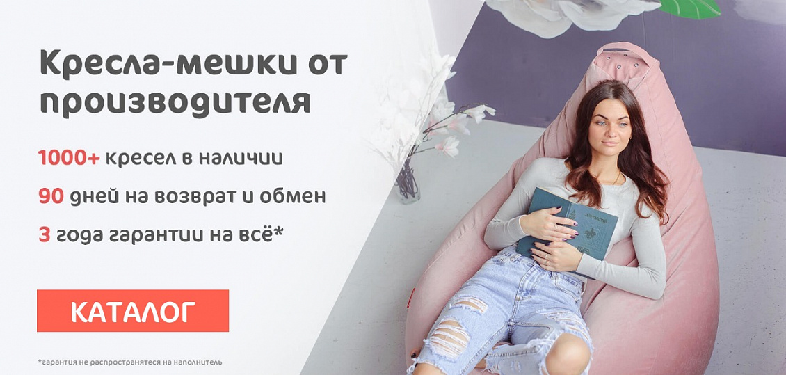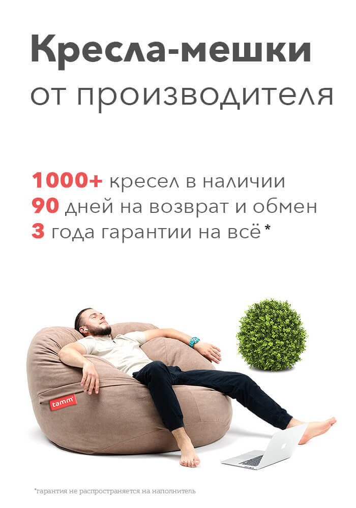 Удобные и долговечные кресла-мешки по ценам фабрики. Более 1000 кресел в наличии, 3 года гарантии на все кресла-мешки, диваны и пуфы и 90 дней на возврат и обмен, если Вы передумали!