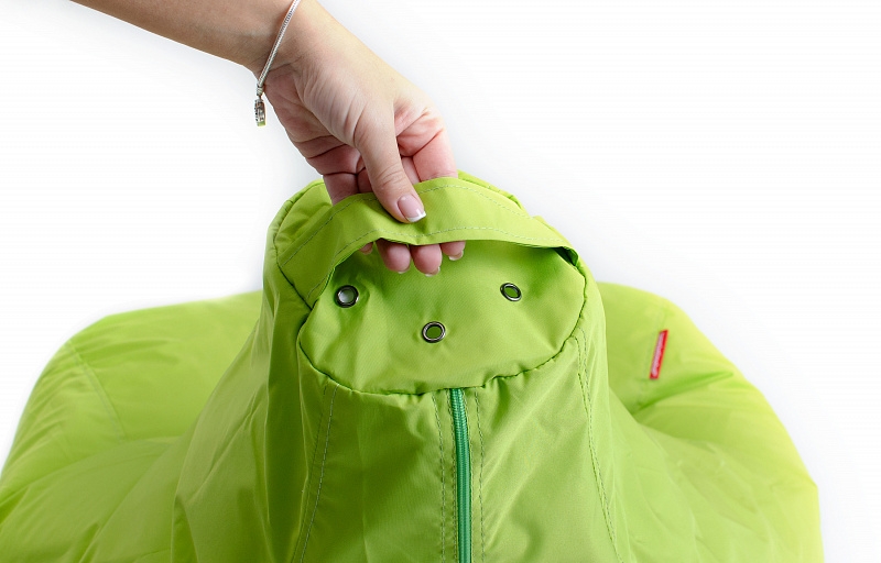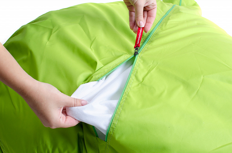Сыпучий наполнитель из полистирола помещен во внутренний нейлоновый и внешний декоративный чехол из мягкого полиэстера, который снимается для чистки. Благодаря непромокаемости и износостойкости съемного чехла кресло можно использовать на природе или в других условиях с большой эксплуатационной нагрузкой.